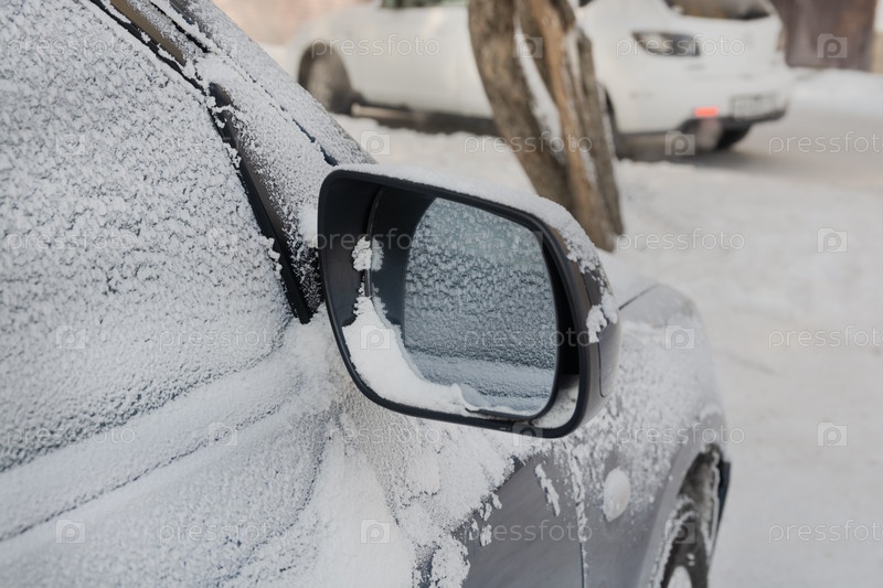 Покрытое снегом зеркало заднего вида автомобиля при сильных морозах