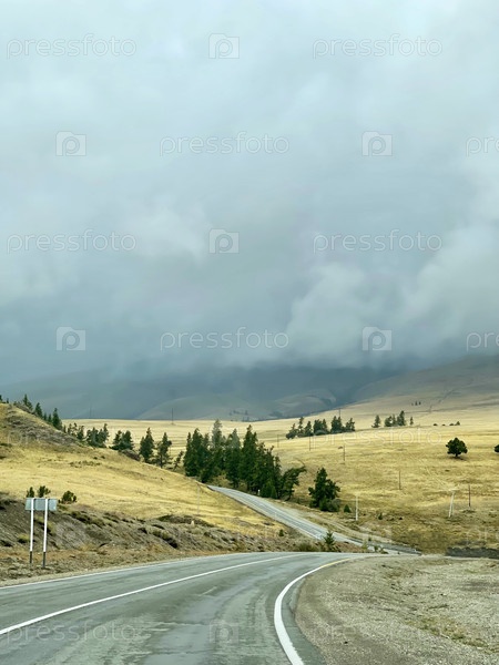 Асфальтированная дорога в горах Алтая.Дорога, простирающаяся далеко вверх по склону.Часть Чуйского тракта, Алтай, Россия