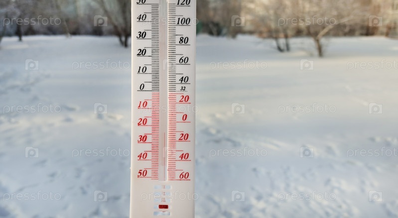 Термометр измеряет температуру наружного воздуха в градусах Цельсия и по Фаренгейту на фоне снега
