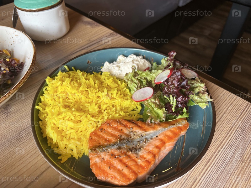 Вкусное филе лосося подается с желтым рисом и свежим салатом в уютном ресторане