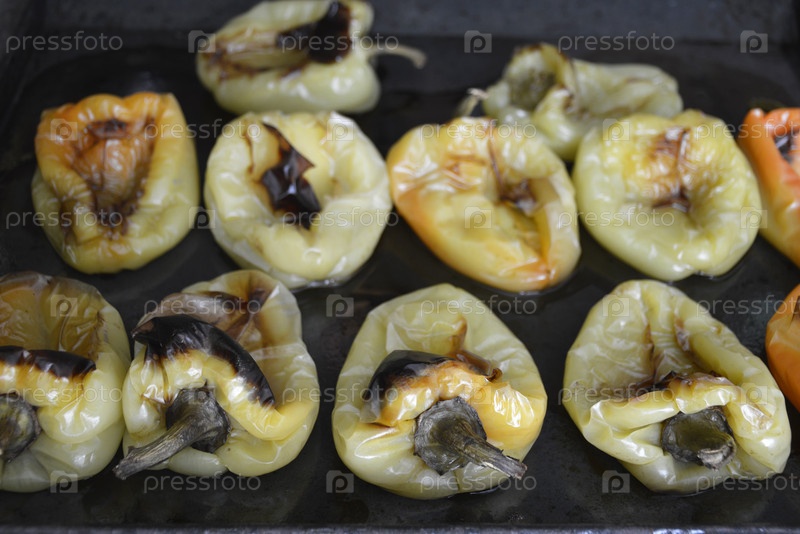 Печьте запеченный перец на черном пекарском листе. ингредиент закуски. приготовьте перец перед подачей с томатным соусом, чесноком и ароматическими травами. ужин дома