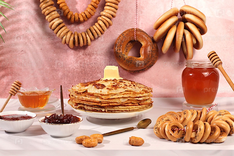 Масленица и традиционная русская кухня.Вкусные российские блины с мягким сыром, медом, вареной мармеладкой, сметаной, икры и бубликов, прецеллы на праздничном столе.Кафе рекламный баннер