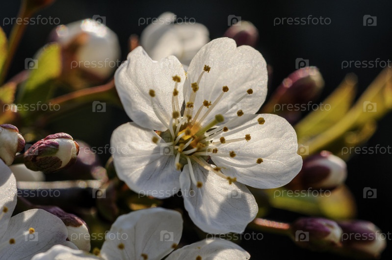 Макро из белых цветов вишни. Близкий план весеннего цвета с нежными лепестками и золотыми штаммами