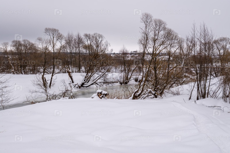 Снежный зимний ландшафт с замерзшей рекой и голыми деревьями