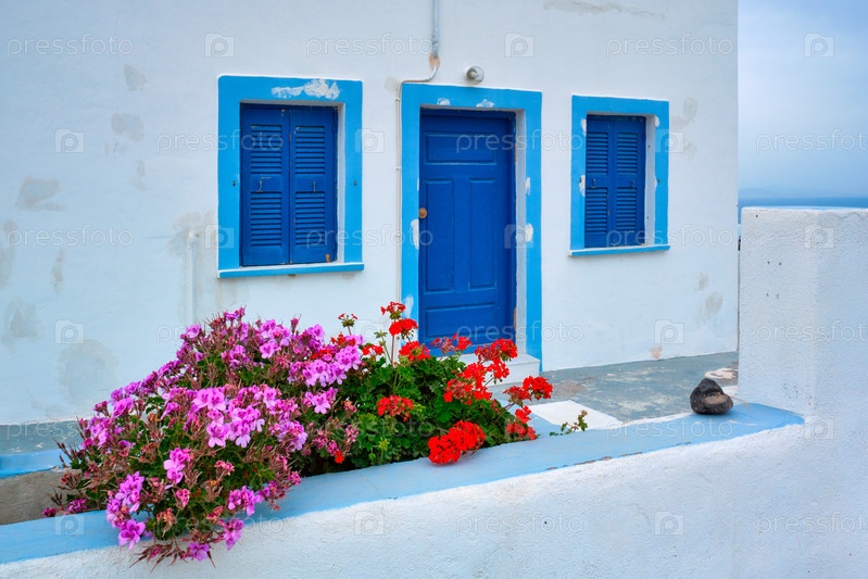 Белый греческий дом с голубыми дверями и жалюзи для окон в деревне Оя на острове Санторини в Греции