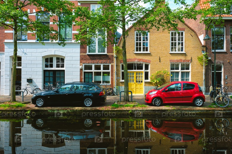 Автомобили на набережной канала на улице Делфт