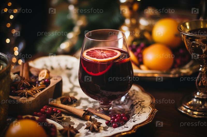 Стакан традиционного горячего вина с апельсиновыми и клюквенными блюдами на уютном рождественском столе.Фон размыт огнями боке и свечами, создавая теплую и праздничную атмосферу