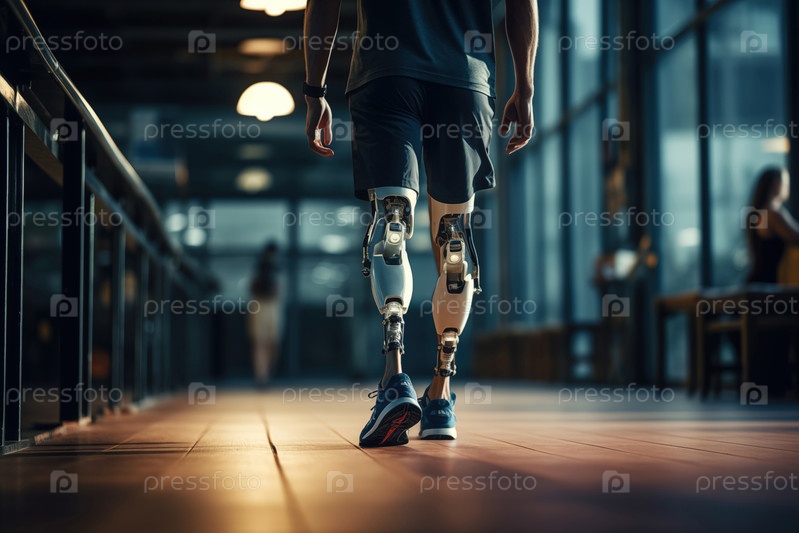 Спортсмен-ампутированный, идущий по коридору с бионическими протезными ногами с роботизированной технологией.Достижения в медицинской науке и технологии, решимость, сила, прогресс инвалидов