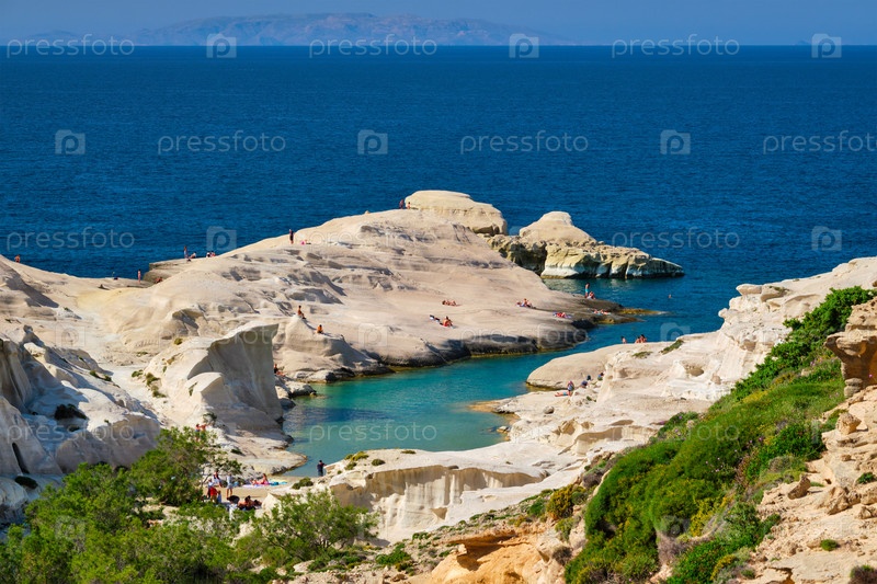 Белые скалы знаменитой туристической достопримечательности острова Милос Sarakinico пляж с туристским отдыхом и Эгейское море, остров Милос, Греция