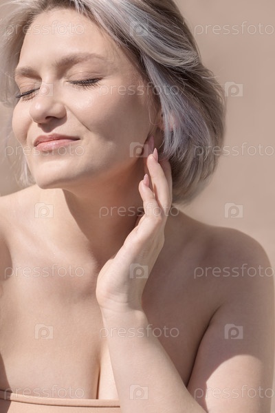 Женщина с короткими серебристыми волосами, нежно прикасающаяся к лицу, наслаждаясь теплом солнечного света, демонстрируя естественную красоту и спокойствие в мягкой минималистической обстановке