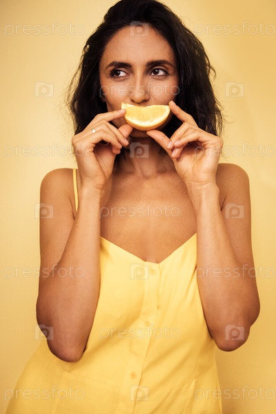Женщина с темными волосами в желтом платье игриво держит кусок лимона во рту на ярко-желтом фоне, олицетворяя свежесть и радость в веселом окружении