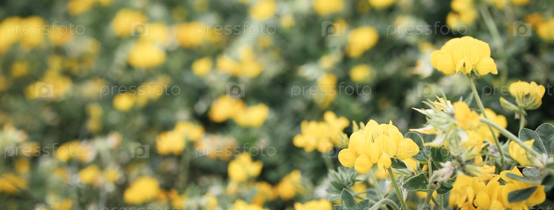 Ярко-желтые дикие цветы обильно цветут на пышном зеленом поле, создавая потрясающий природный пейзаж, наполненный цветами и жизнью, идеально подходит для весенних тем и цветочных рисунков