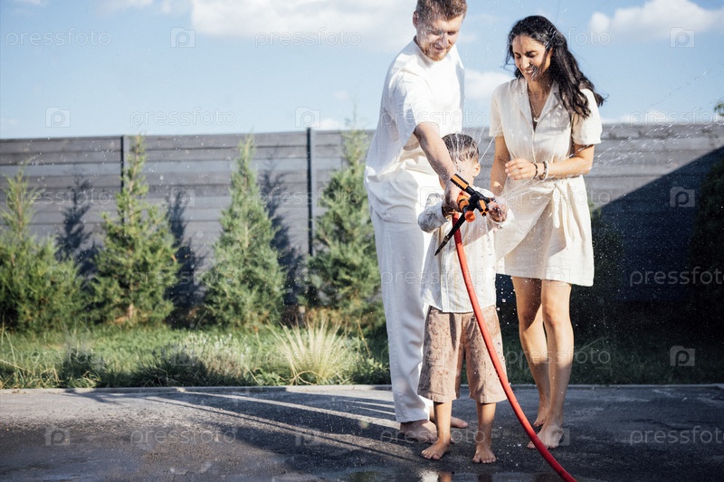 Семья наслаждается солнечным днем на свежем воздухе, играя с водяным шлангом, создавая радостные моменты и смех, в окружении зелени и ярко-синего неба, захватывая летнее веселье