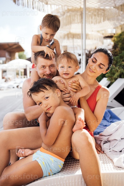 Семья наслаждается летним отдыхом на курорте, дети весело играют вокруг своих родителей, фиксируя моменты счастья и единства у бассейна