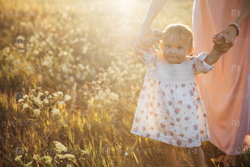 Маленькую девочку в цветочном платье держит взрослый человек в розовом платье, который гуляет по солнечному поле с дикими цветами, захватывая момент радости и связи в природе