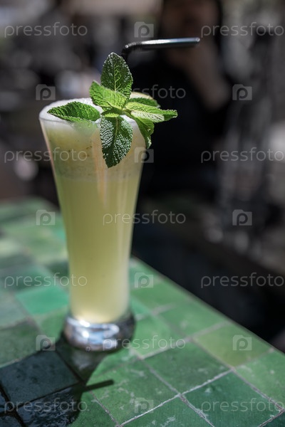 Освежающий напиток в высоком стекле, украшенный свежими листьями мяты, размещенным на текстурированной зеленой поверхности плитки, демонстрируя яркий напиток для летнего удовольствия и расслабления