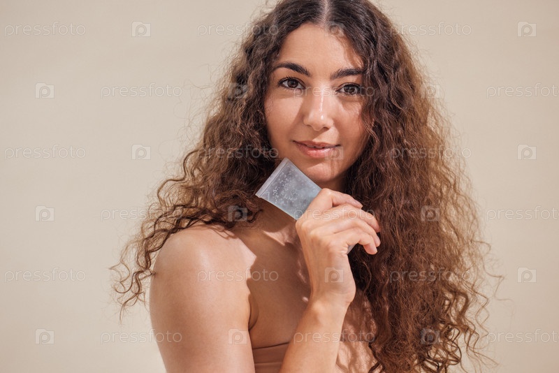 Молодая женщина с кудрявыми волосами держит инструмент по уходу за кожей, демонстрируя рутину красоты в минималистической обстановке, подчеркивая самообслуживание и оздоровительные практики для здоровой кожи