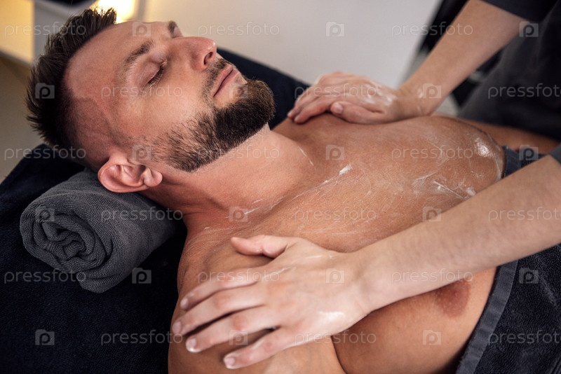 Клиент мужского пола, получающий расслабляющую массажную терапию в спокойной спа-среде с мягким освещением и полотенцами, которые способствуют исцелению и самообслуживанию