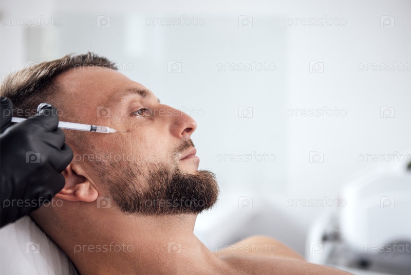 Клиент-мужчина получает косметическое лечение в современной клинике с акцентом на процедуру улучшения лица, демонстрируя профессиональную помощь и лучшие практики