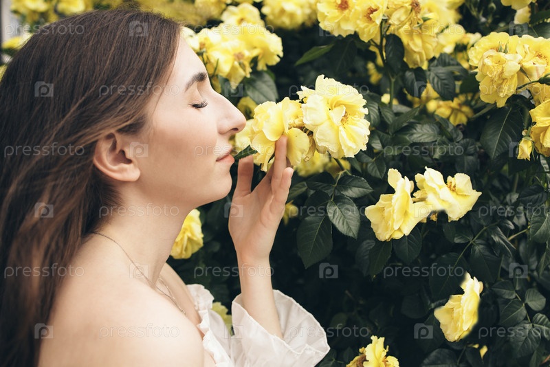 Молодая женщина с длинными коричневыми волосами нежно касается желтых роз в цветущем саду, наслаждаясь ароматом и красотой природы, воплощая спокойствие и связь с окружающей средой