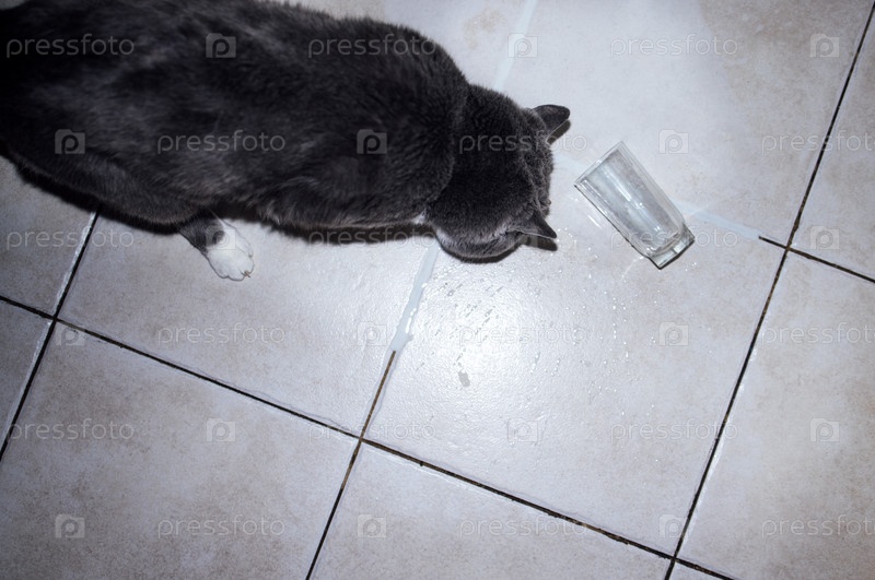 Серая кошка любопытно рассматривает разлитое стекло на плиточном полу, демонстрируя игривое поведение и последствия случайного беспорядка в уютной домашней среде