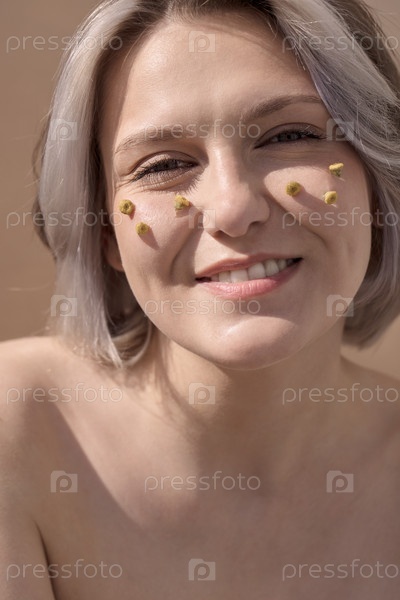 Молодая женщина с короткими светлыми волосами, улыбающаяся радостно, украшенная желтыми лепестками цветов на щеках, демонстрируя естественную красоту и спокойную атмосферу в мягкой атмосфере света