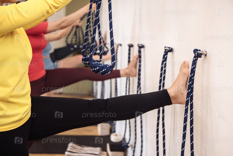 Группа женщин, практикующих йогу с ремнями на стене, демонстрируя гибкость и силу в спокойной обстановке студии, способствующей здоровью и осознанности