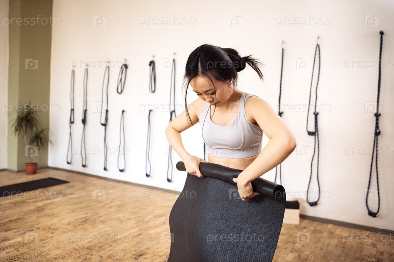 Азиатская женщина в активной одежде подкатывает коврик для йоги в живой фитнес-студии с тренажерами и веревками на стенах, готовясь к тренировке