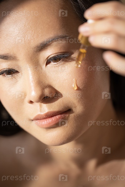 Азиатская женщина наносит сыворотку для лица с капелькой, демонстрируя рутину ухода за кожей, освещенную мягким естественным светом, подчеркивая здоровую кожу и методы по уходу за красотой
