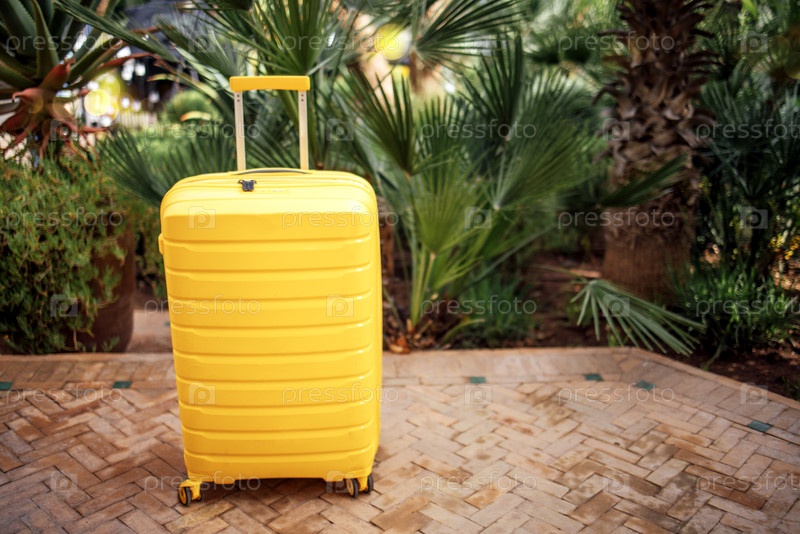 Ярко-желтый чемодан стоит на рисунковой каменной дорожке, окруженной пышными зелеными тропическими растениями, символизирующими путешествия, приключения и исследования в яркой внешней среде