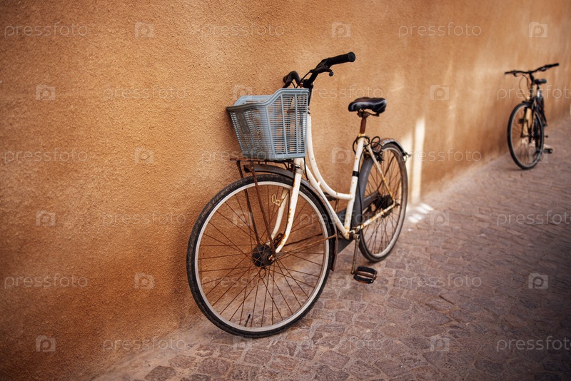 Винтажный велосипед с голубой корзиной, опирающийся на текстурированную стену, демонстрирует очарование города и ностальгическую атмосферу в солнечной булыжной аллее