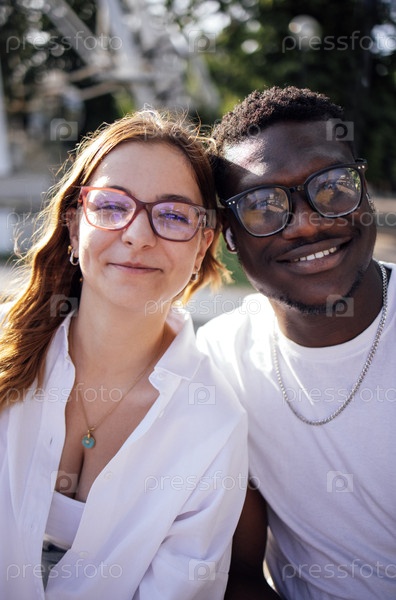 Улыбающаяся молодая пара, женщина в очках и мужчина в солнцезащитных очках наслаждаются солнечным днем на свежем воздухе, захватывая момент радости и связи в яркой атмосфере