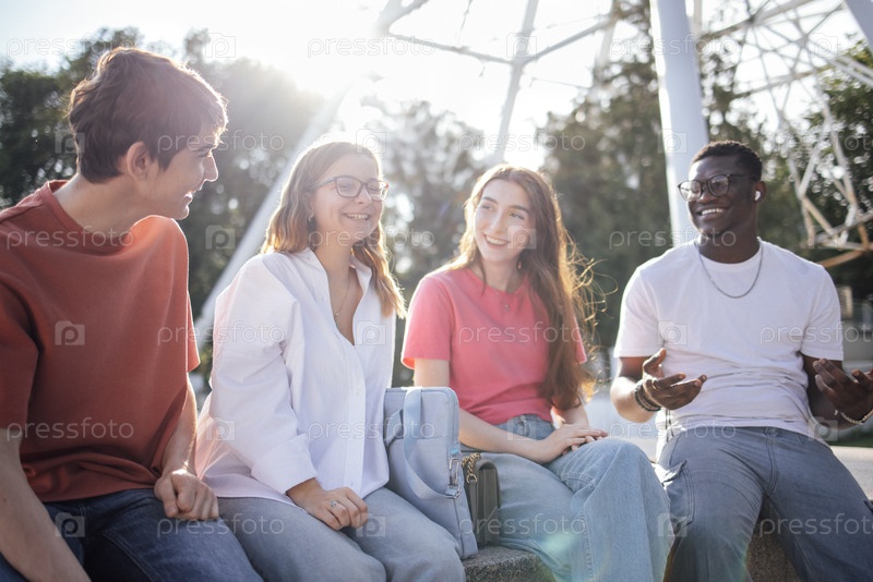 Группа разнообразных молодых людей сидит вместе на открытом воздухе, наслаждаясь беседой и смехом, в окружении современной архитектуры и естественного света, захватывая дружбу и связь