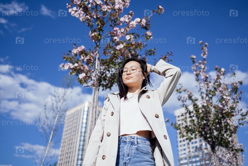 Молодая азиатская женщина в стильном пальто уверенно стоит на улице, окружена цветущими деревьями и современными зданиями, наслаждаясь солнечным днем в городской среде