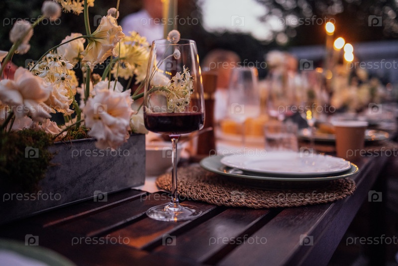 Элегантная столовая на открытом воздухе с красиво устроенным столом с цветочными центральными элементами, винными стаканами и тарелками, создает теплую и привлекательную атмосферу для собраний