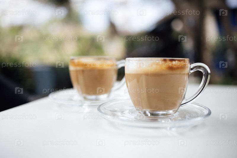 Две прозрачные стаканчики, заполненные сливочным кофе сидят на белом столе в окружении мягкого размытого фона, создавая теплую и привлекательную атмосферу для любителей кофе