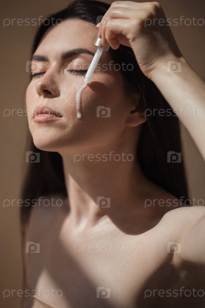 Молодая женщина наносит сыворотку на лицо капельницей, демонстрируя рутину ухода за кожей, освещенную мягким естественным светом, подчеркивая красоту и методы самообслуживания