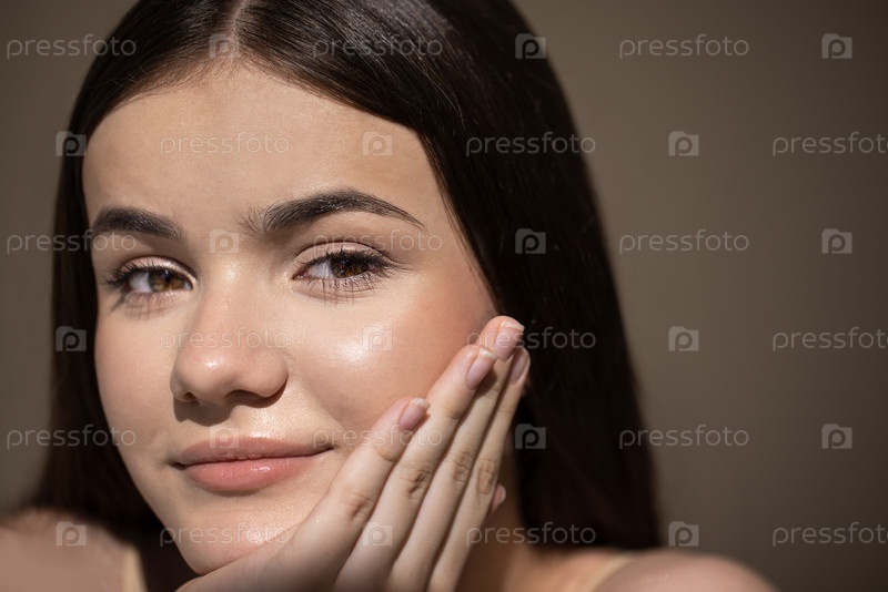 Молодая женщина с длинными темными волосами нежно опускает подбородок на руку, показывая спокойное выражение и сияющую кожу в мягком естественном свете, отражая красоту и уверенность