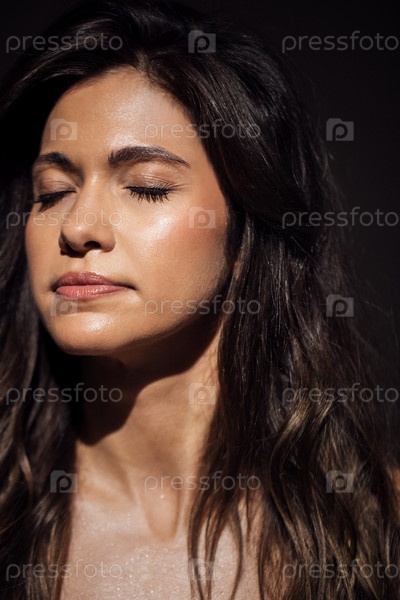 Женская модель с длинными темными волосами, закрытыми глазами, демонстрирующая естественную красоту и безмятежное выражение лица, освещенная мягким светом на тёмном фоне, подчеркивая спокойствие и умиротворение