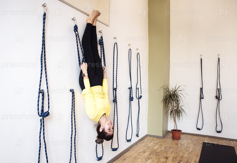 Женщина практикует йогу в перевернутом положении, подвешенной веревками на стене, демонстрируя гибкость и силу в спокойной обстановке в комнате с естественным светом