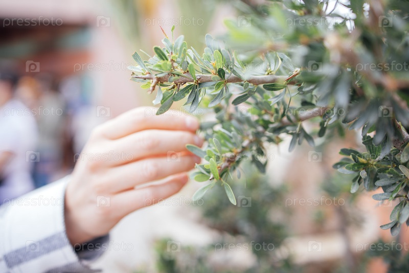 Близкий план руки, нежно касающейся зеленых листьев на кусте в естественной наружной обстановке с размытыми элементами фона, создающими спокойную атмосферу