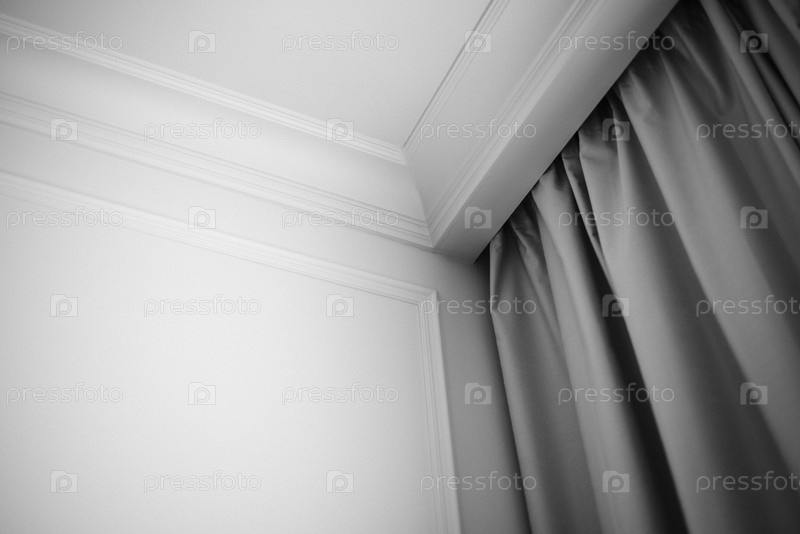 Элегантный уголок интерьера с мягкими серыми шторами и нетронутыми белыми стенами, демонстрируя минималистический эстетический дизайн с чистыми линиями и тонкой текстурой для современных жилых помещений