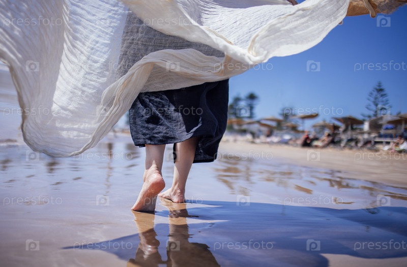Женщина ходит босиком по песчаному пляжу, белая ткань размахивает ветром отражая солнечный свет на воде, захватывая спокойный летний момент свободы и радости