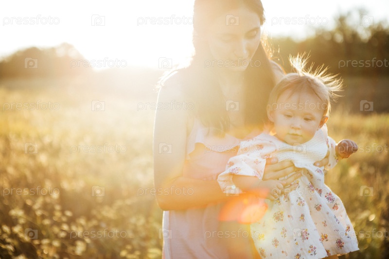 Женщина, держащая ребенка на солнечном поле, в окружении высокой травы и теплого солнечного света, захватывает момент нежности и связи в спокойной внешней среде