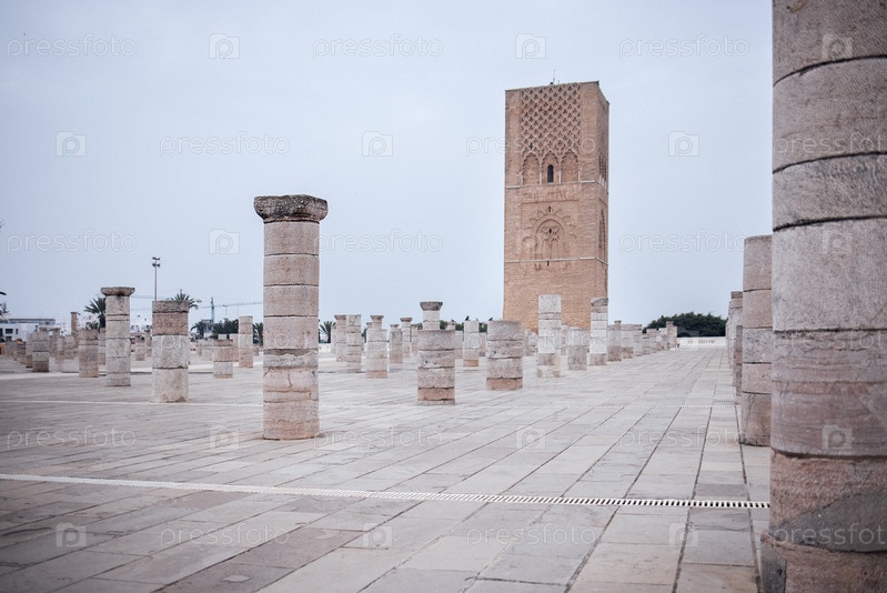 Исторические каменные колонны стоят на обширной открытой площади с высокой древней башней на заднем плане, демонстрируя архитектурную красоту и культурное наследие в спокойной атмосфере