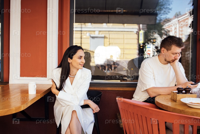 Женщина в белом наряде сидит за столом кафе, ведет разговор с мужчиной в повседневной одежде, демонстрирует социальное взаимодействие и городской образ жизни в яркой обстановке