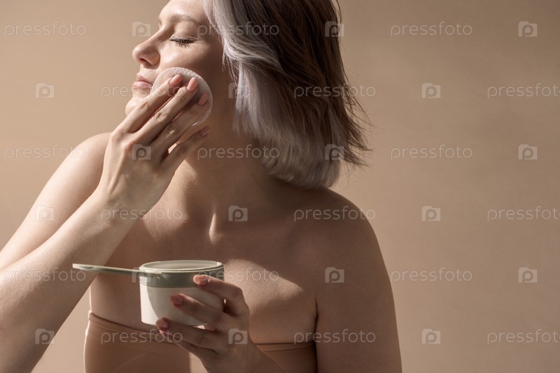 Женщина с короткими волосами наносит крем для лица на кожу, держит банку в руке и демонстрирует рутину ухода за кожей в спокойной минималистической обстановке с мягким освещением