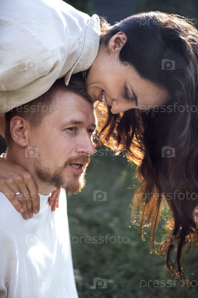 Пара, наслаждающаяся игровым моментом на свежем воздухе, с женщиной, игриво склонившейся над плечом мужчины в окружении пышного зелени, захватывающая радость и связь в естественной обстановке