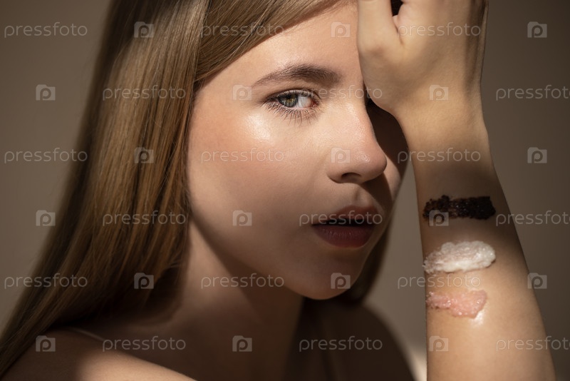 Молодая женщина с длинными волосами позирует элегантно, демонстрируя косметику на руке, освещенную мягким естественным светом, подчеркивая концепции ухода за кожей и самообслуживания
