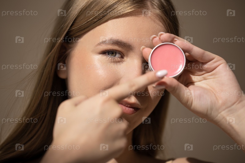 Молодая женщина с длинными волосами показывает круглый контейнер рубашки, указывая на него с улыбкой, подчеркивая красоту и уход за кожей в мягком естественном освещении